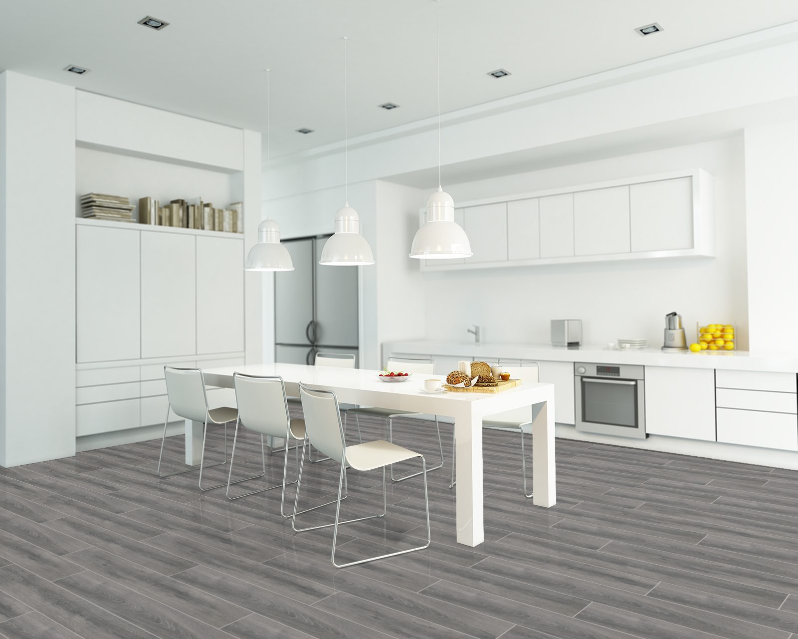 Create a bold, contemporary space with Brussels. This laminate flooring features a sophisticated, dark grey wood-look decor with a smoky, weathered appearance. The flowing grain pattern adds an authentic touch, offering a chic and dramatic look that’s perfect for modern interiors.