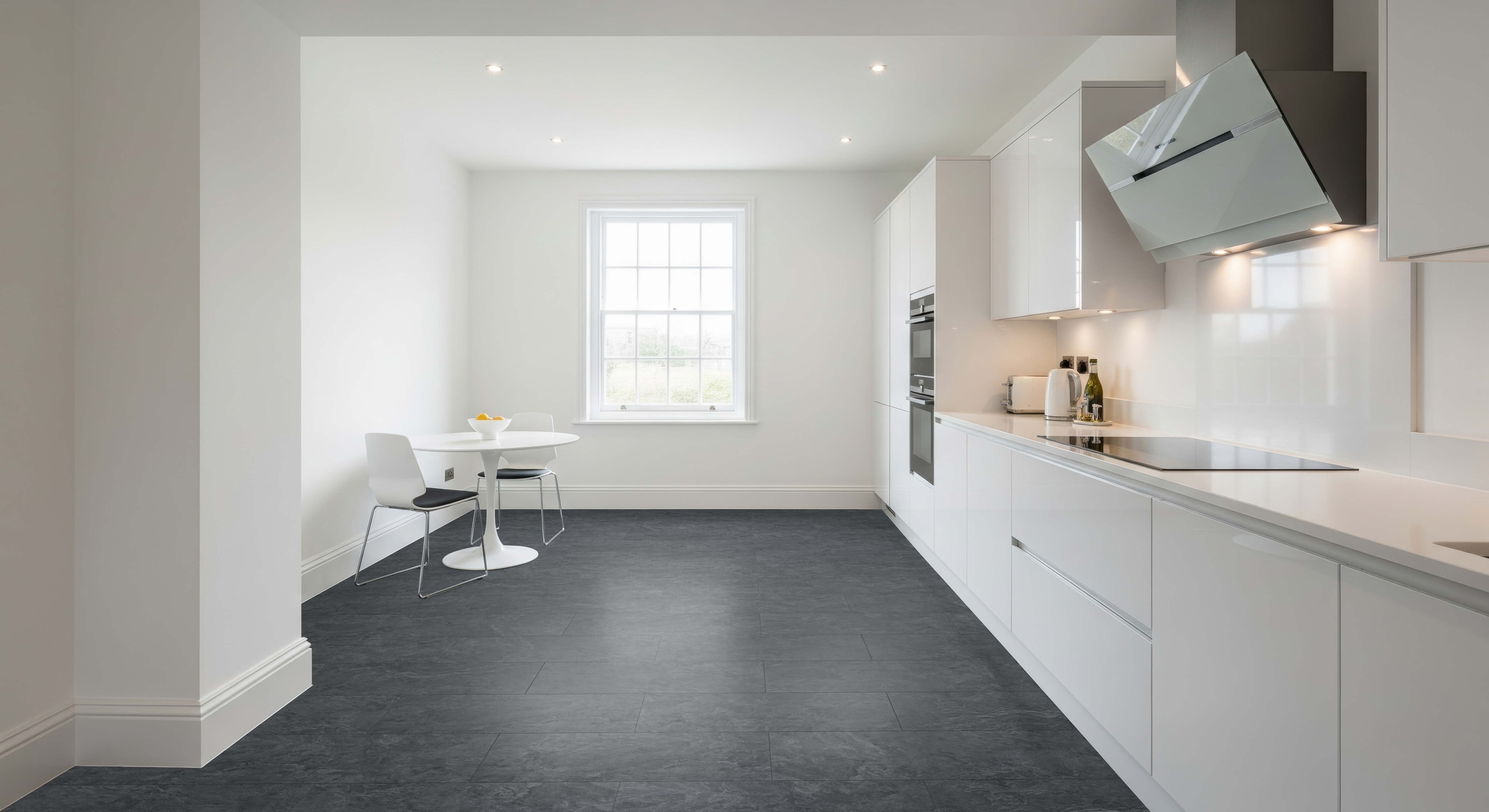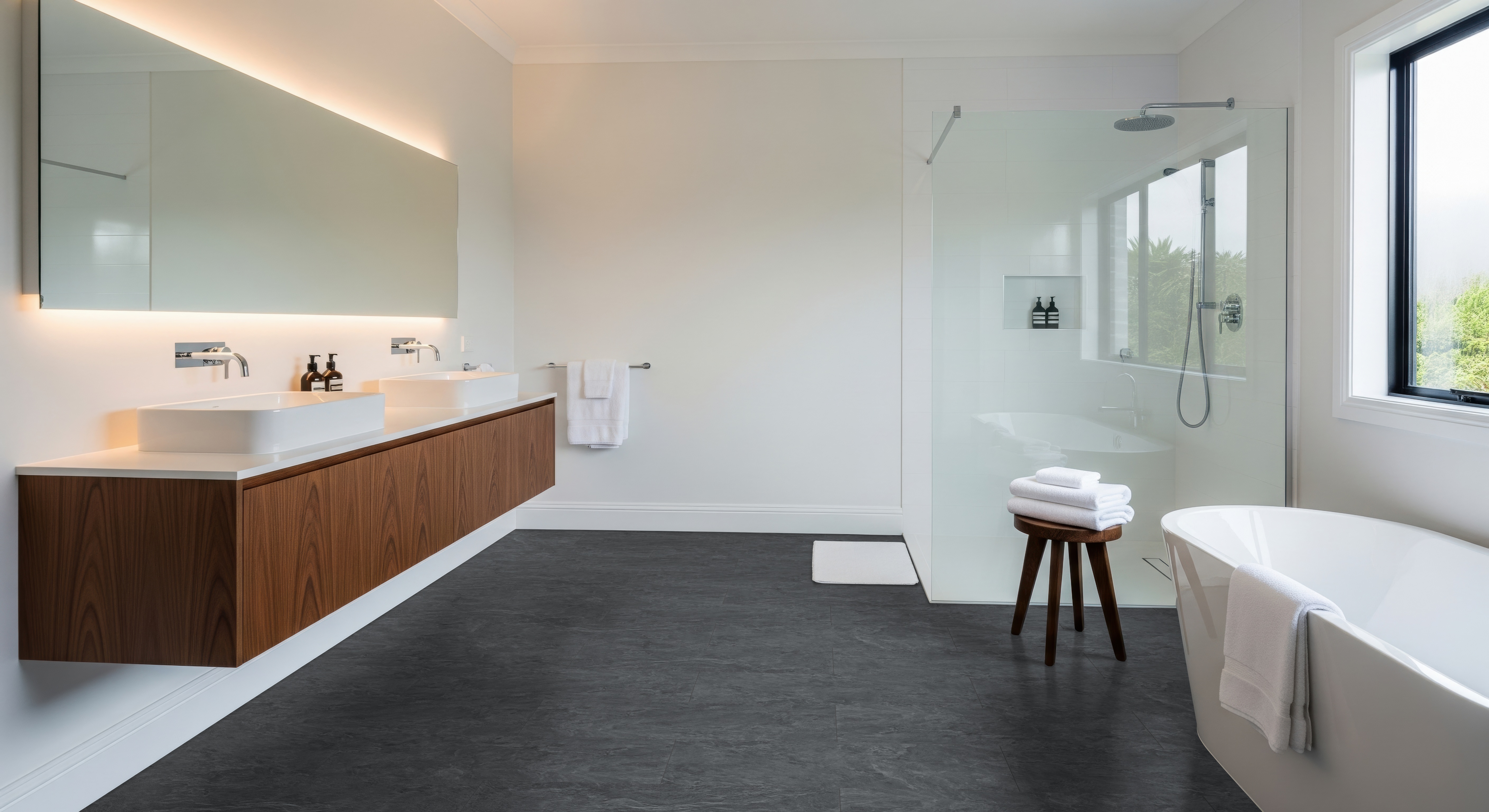 The Pro-Tek™ Editions Tiles range delivers all the aesthetic beauty of charcoal slate but adds a layer of underfoot warmth and comfort that real stone tiles do not. A dramatic and authentic palette of deep charcoal and near-black, with a realistic riven texture that captures the raw, layered beauty of natural slate stone, all with the high performance and low cost of modern vinyl click flooring.