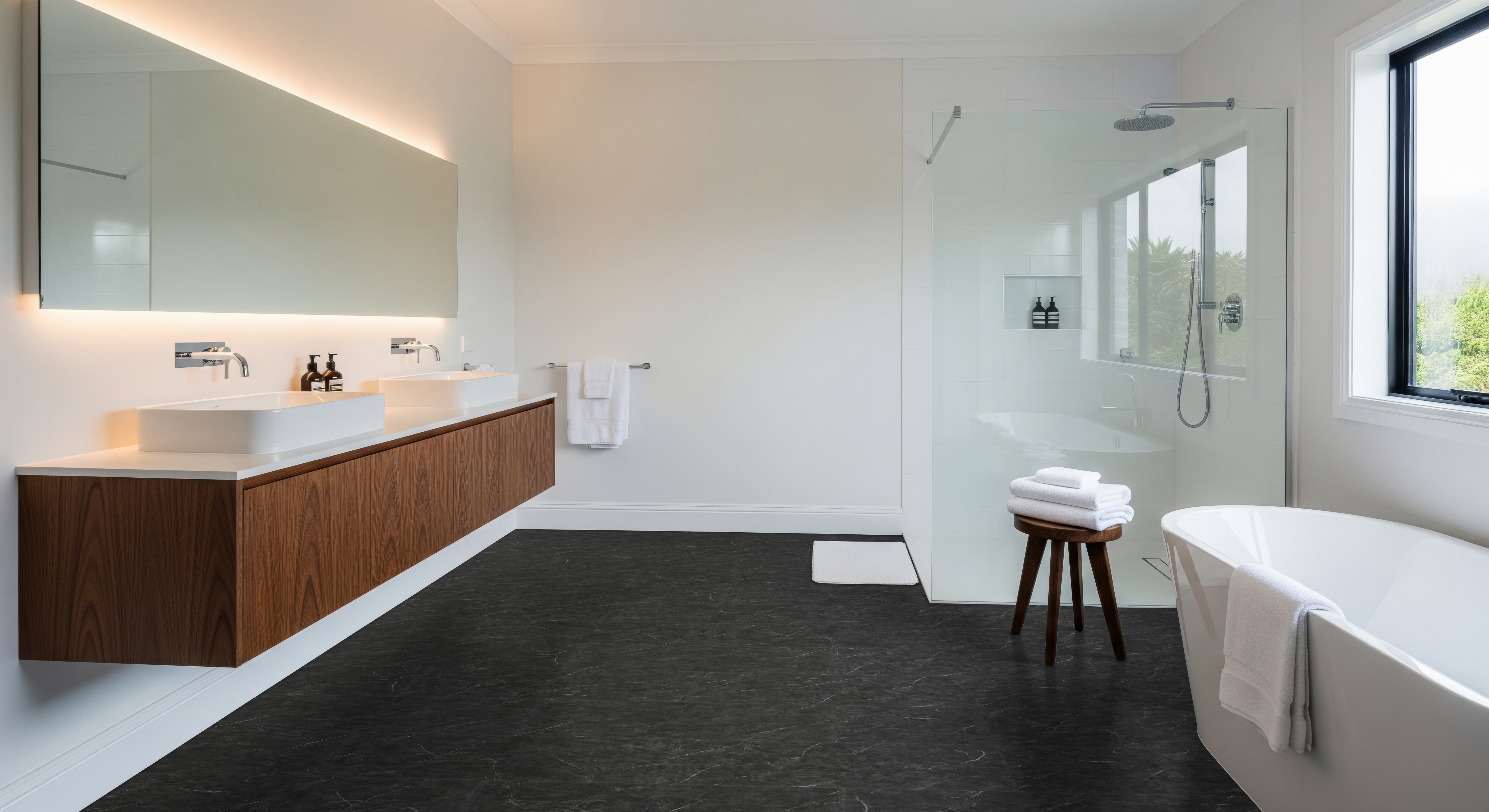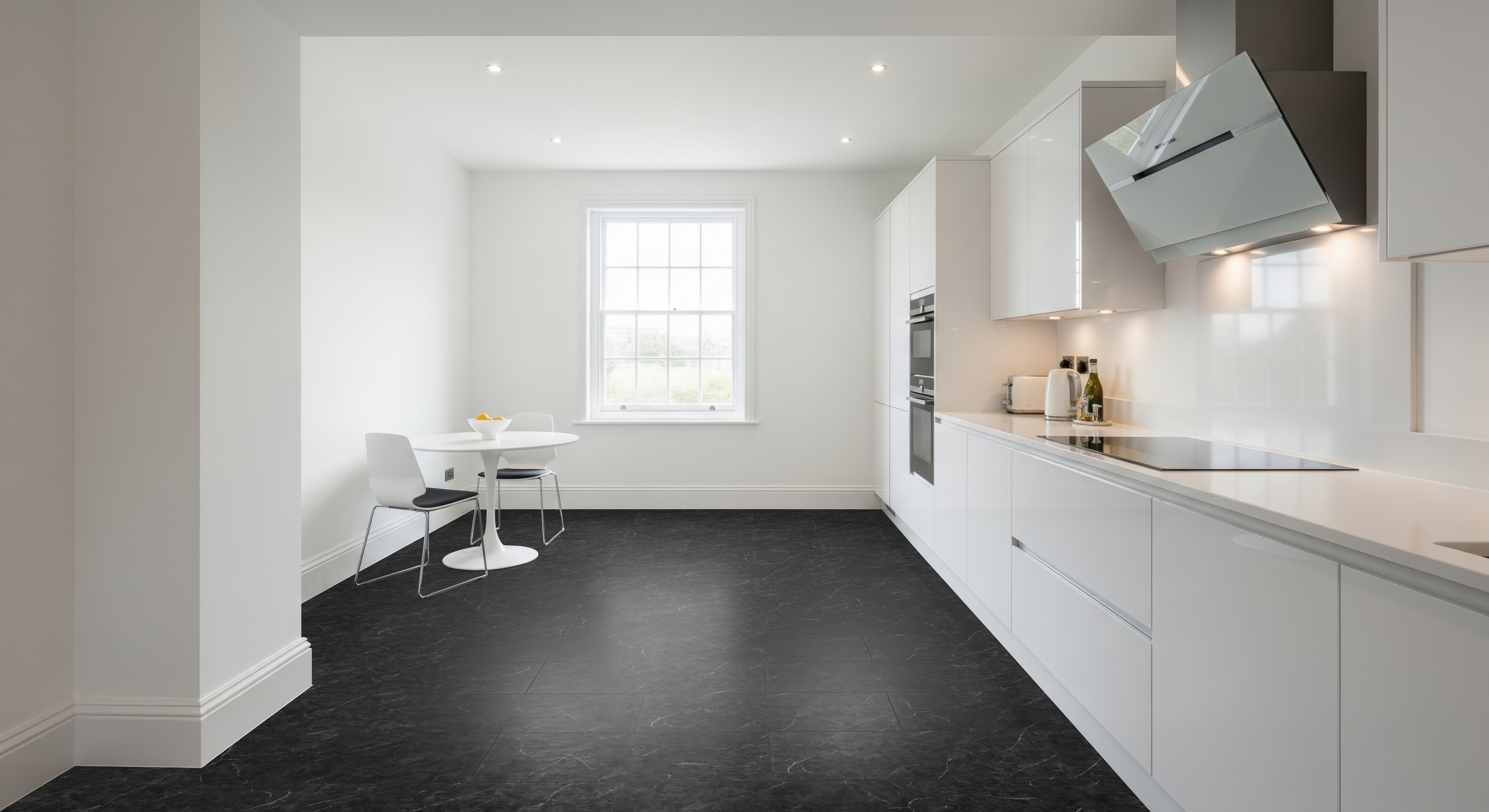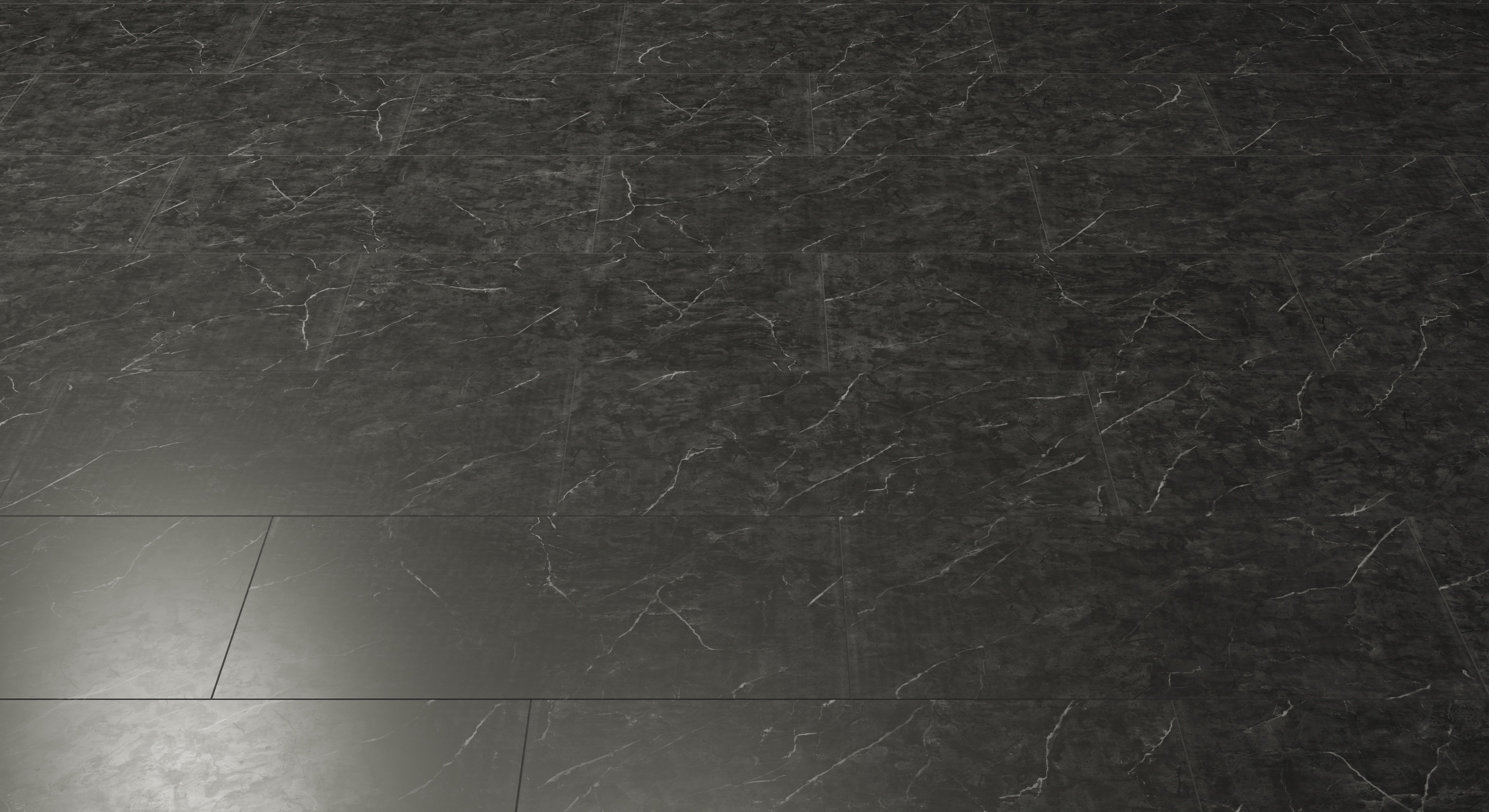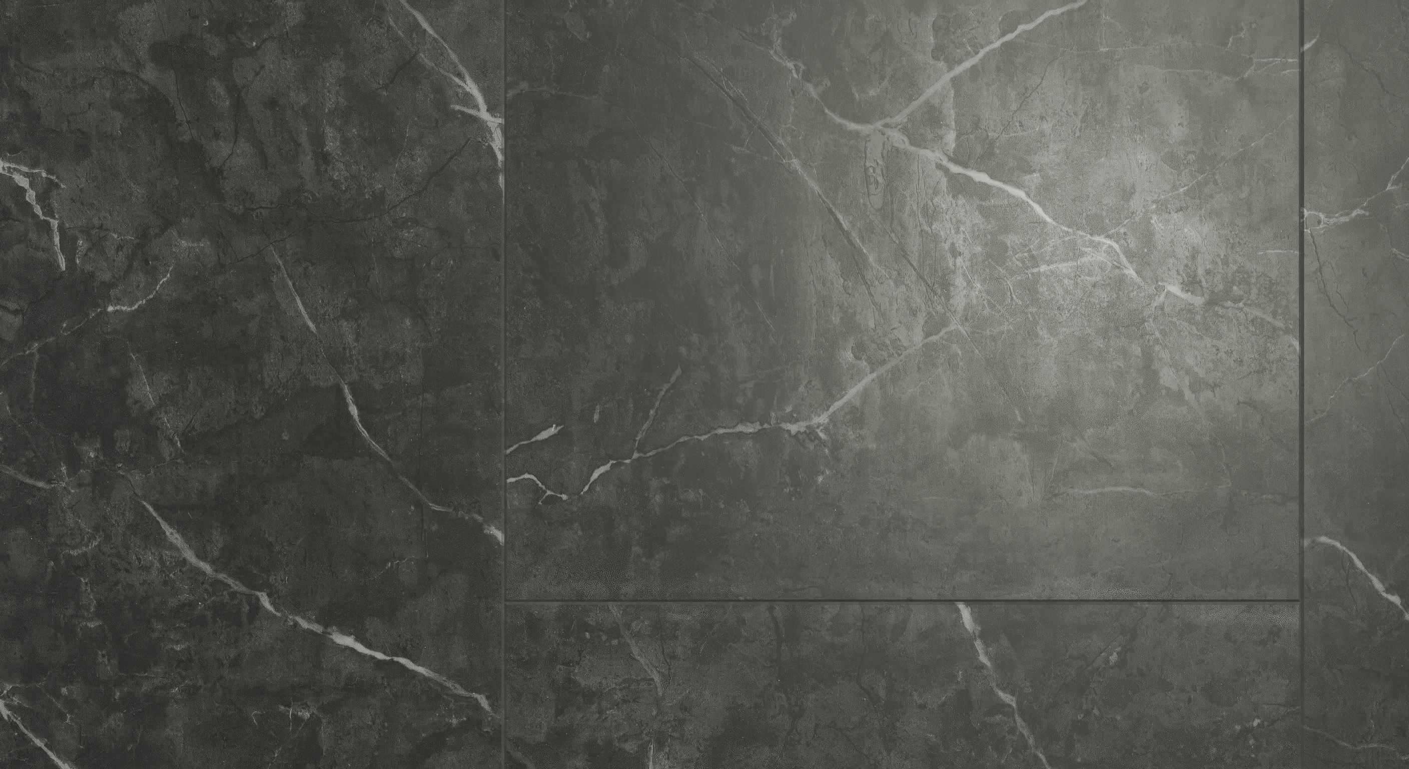 The Pro-Tek™ Editions Tiles range delivers all the aesthetic beauty of Vesuvian marble but adds a layer of underfoot warmth and comfort that real stone tiles do not. A bold and dramatic palette of deep, dark charcoal, sliced through with striking, high-contrast veins of brilliant white to create a powerful and luxurious statement, all with the high performance and low cost of modern vinyl click flooring.