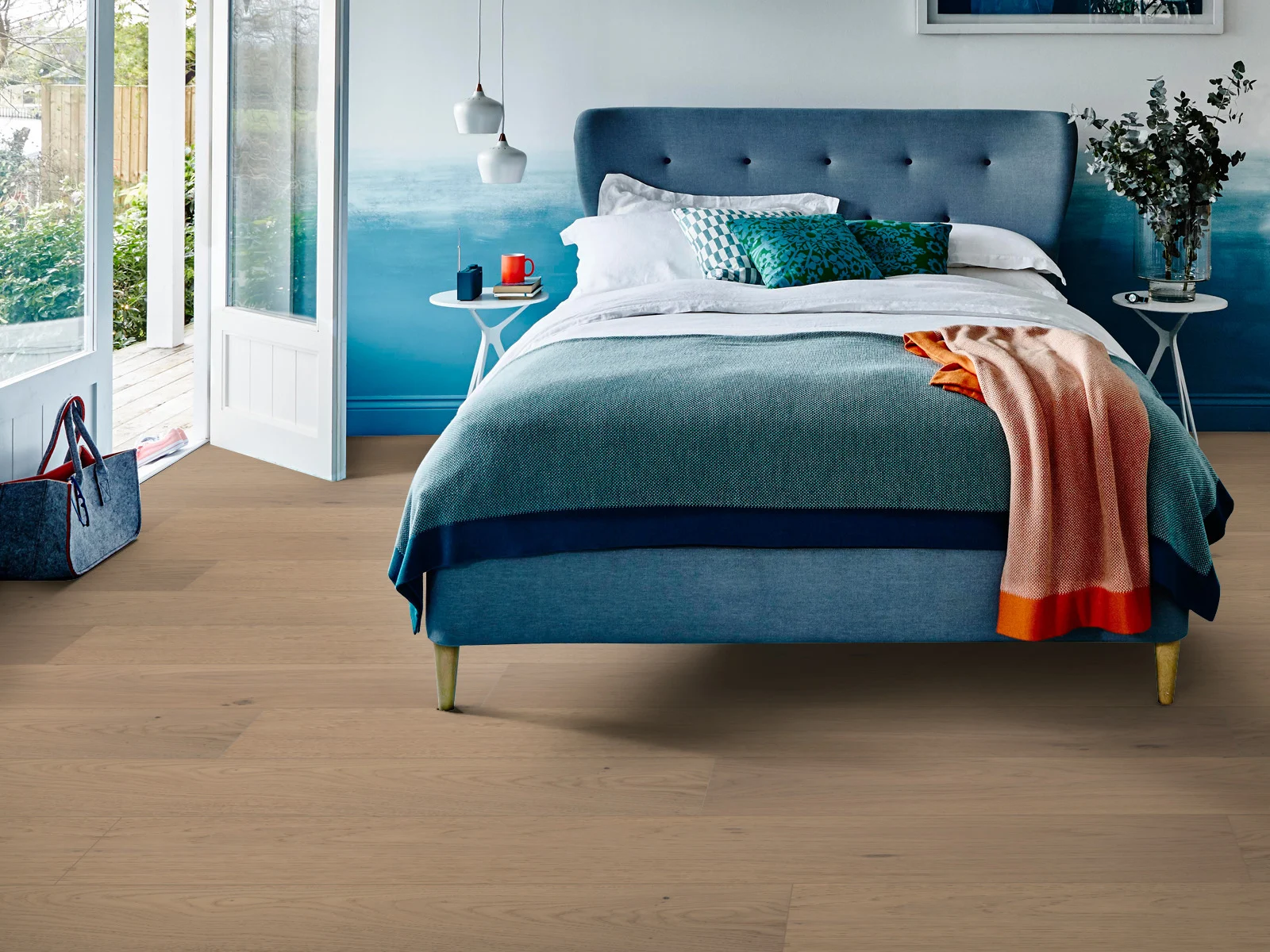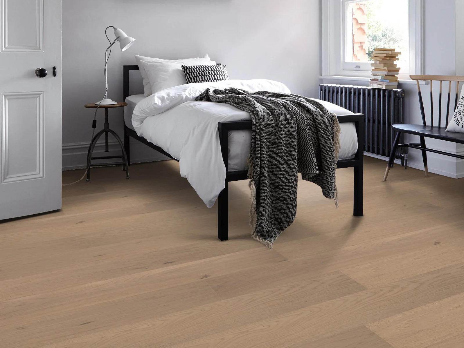 Inspired by the bright, clean vistas of snow-capped peaks, Everest Oak features a pale, frosty white finish over a rustic oak base. This beautiful contrast highlights the natural knots and grain of the timber, creating a floor that is both airy and full of contemporary character.