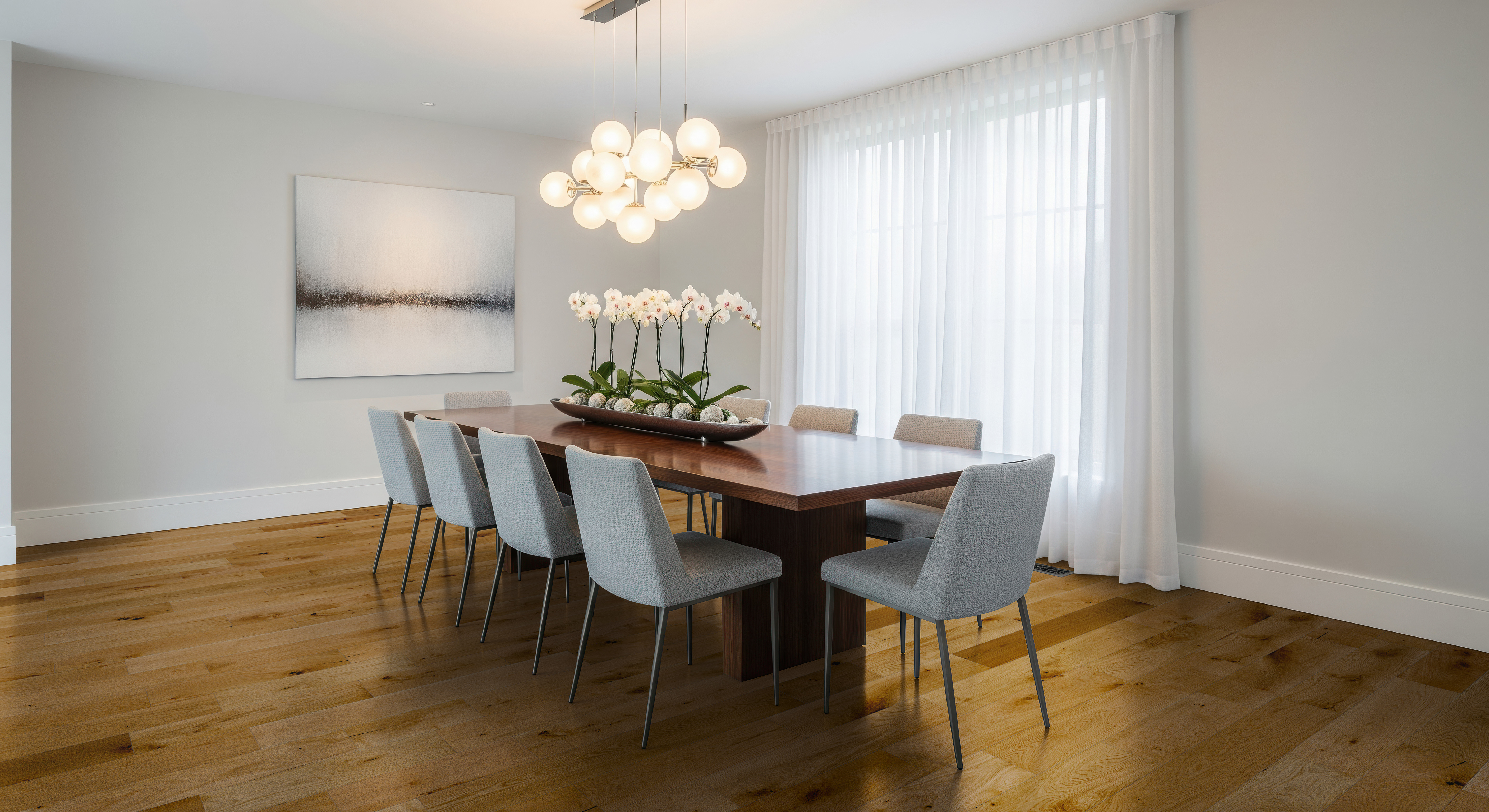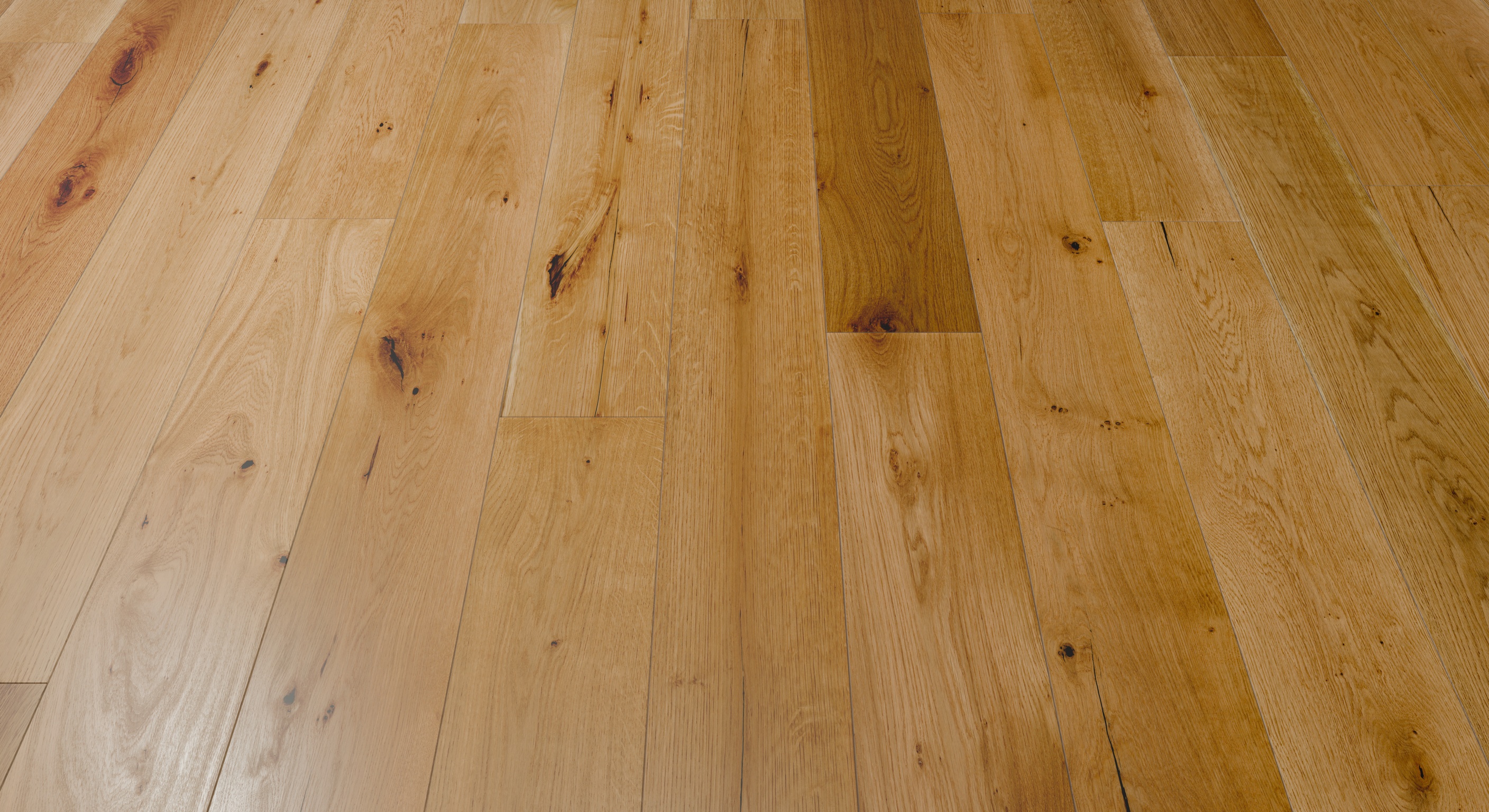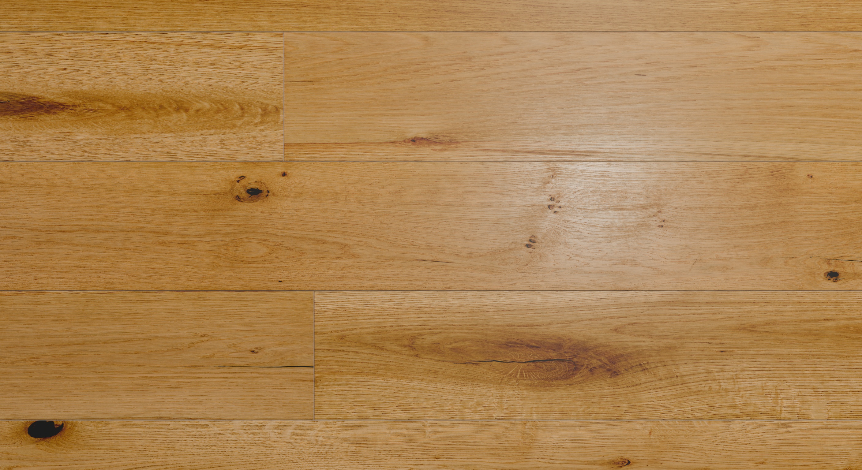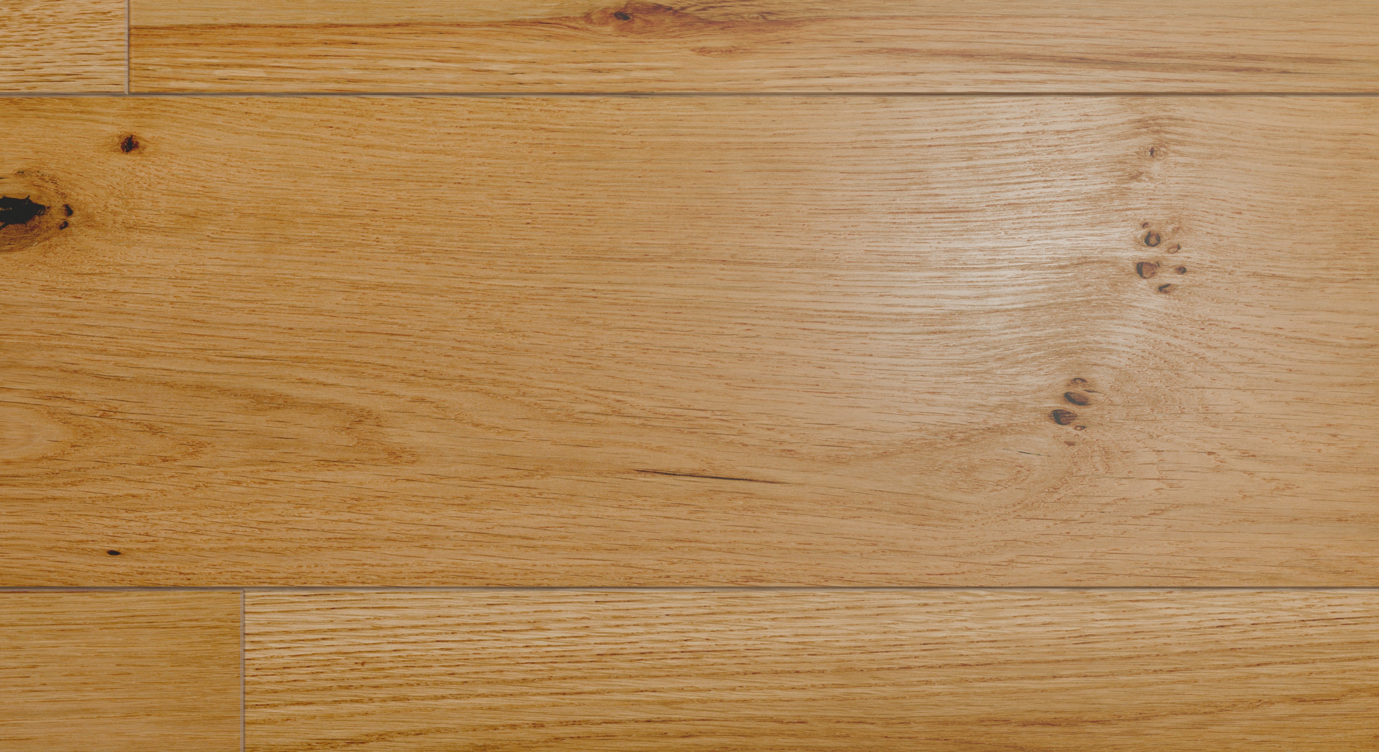 A warm and inviting palette of natural, honeyed oak with golden undertones, this flooring showcases the full spectrum of rustic-grade character, from swirling grain patterns to natural knots, creating a truly classic and welcoming atmosphere.