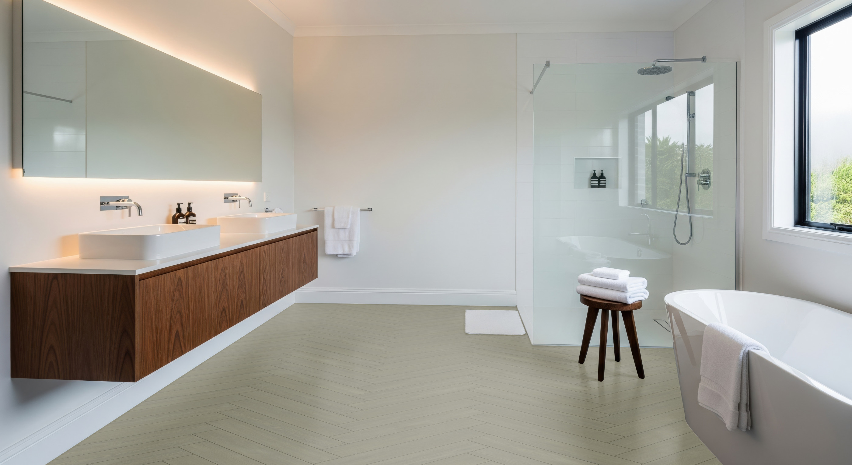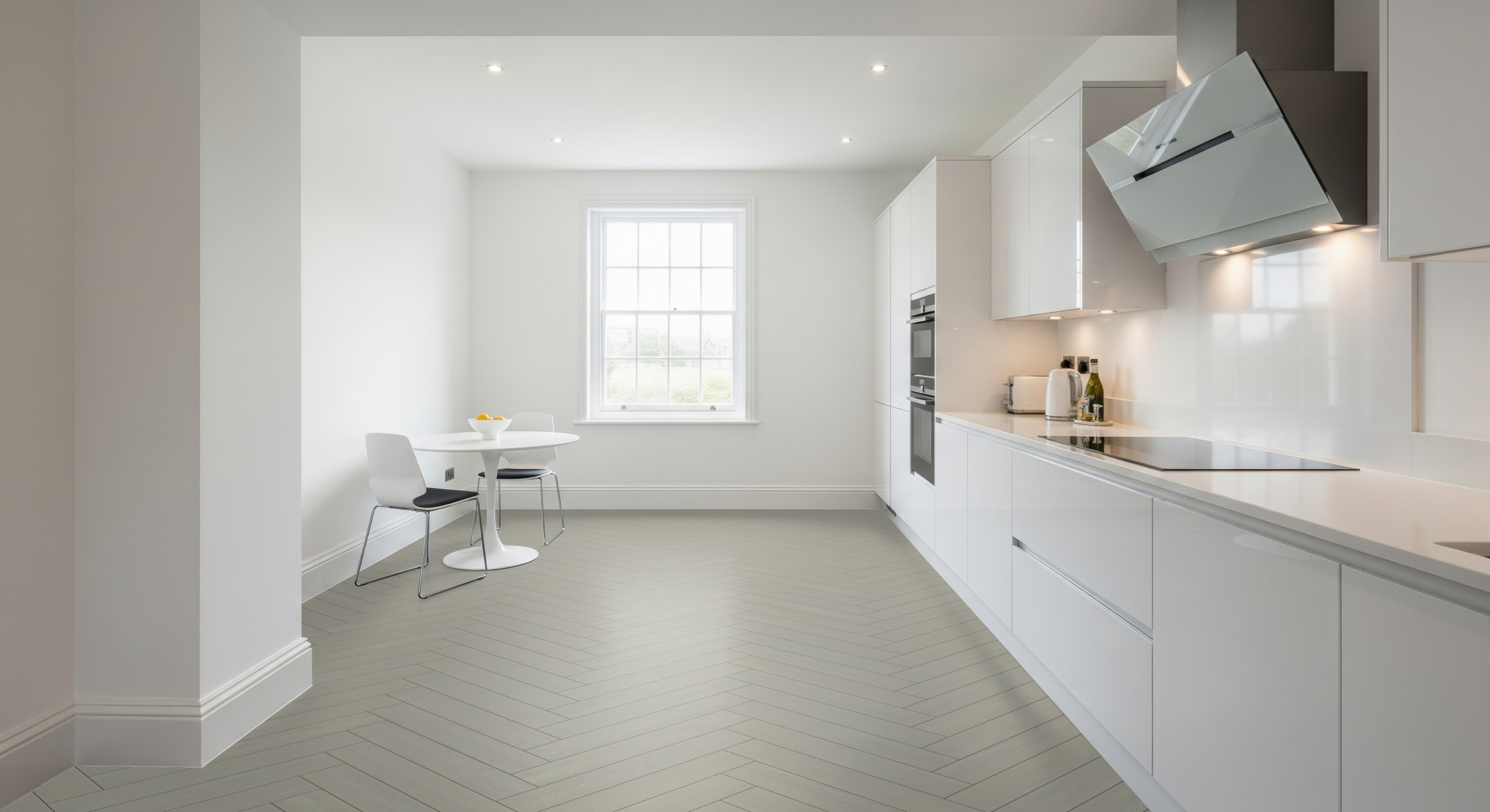 Create a stunning and sophisticated space with Pro-Tek™ Hampton Grey Herringbone Flooring. A bright and ethereal palette of soft off-white and pale stone hues, with delicate ivory undertones that create a clean, spacious, and luxurious atmosphere, but with the high performance and low cost of modern vinyl click flooring.